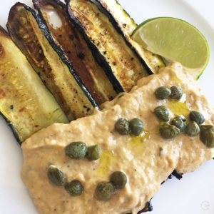 Serving | Layer the zucchini onto the plates and spoon the aubergine cream over them. Add the remaining capers on top, drizzle a little olive oil and serve with a lime wedge.