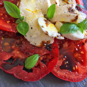 Garden-grown or local tomatoes when in season, are full of aroma – tomatoes that had their roots in the soil, and the fruits in the sun are so much superior to the all-year-round greenhouse tomatoes. Together with good quality Mozzarella cheese, fresh basil, and drizzles of virgin olive oil and aged Aceto Balsamico, it is a summers delight – the classic Italian Insalata Caprese.