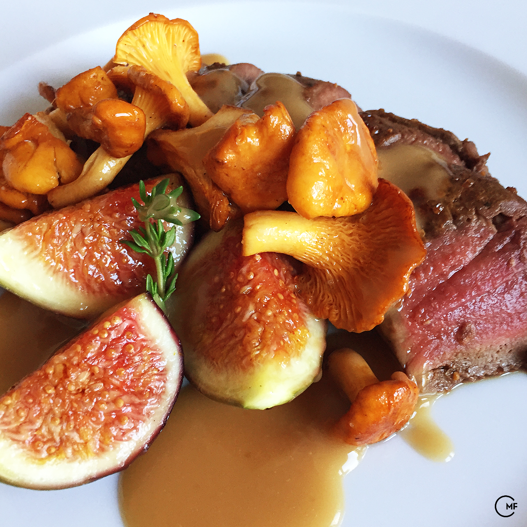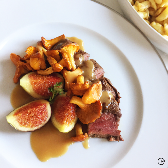 When summer draws to an end, an abundance of fruits and vegetables are harvested and on sale in markets. It's also the hunting season in the alpine regions of Europe delivering wild game. I combined the tender venison fillet, with fresh chanterelles and figs on a slightly spicy and creamy wild game sauce. I like it when the fillet is a bit pink inside – if you do not like it that way, you can cook the meat a little longer – but please not until it's completely dry.