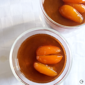 - In a pan, dissolve the sugar in the water and add the kumquat quarters. Simmer on low heat and boil the liquid to a thick syrup. Set aside to cool.