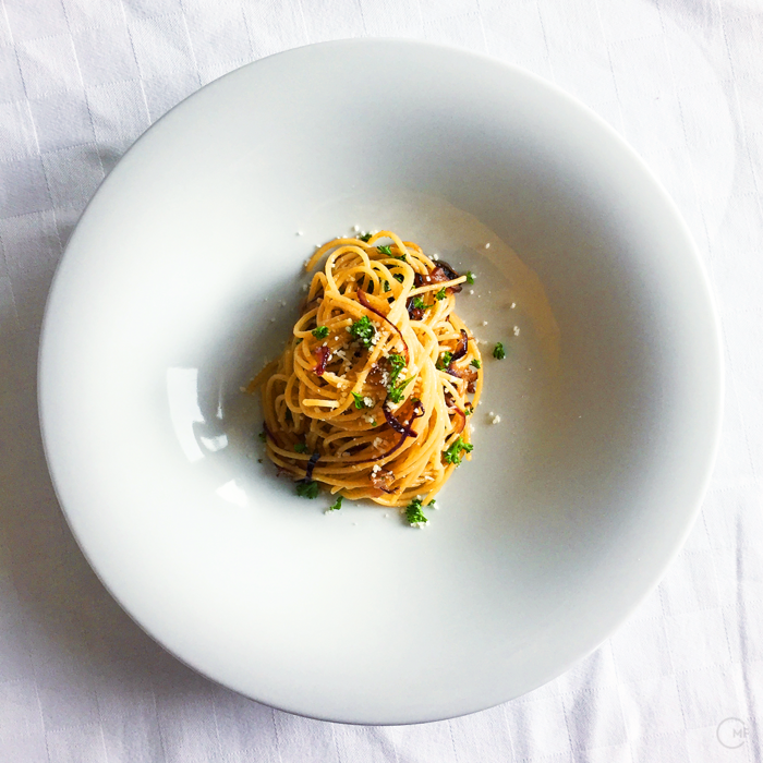 This is possibly one of the simplest spaghetti dishes and a very tasty one too. The few ingredients create a flavourful salty and sweet sauce. The slow-cooked onions caramelise and the anchovies melt to a salty, thick paste. Add a little parsley for a kick of freshness and toss your al dente Spaghetti in the sauce.