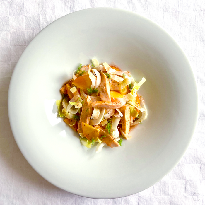 I love fennel, the subtle aniseed flavour is unique to vegetables, and raw it's ideal for a crunchy salad. I paired the fennel with slightly bitter cultivated chicory and tangy-sweet persimmon kaki. Together with a tarragon-mustard vinaigrette and some added chicken strips create a tasteful, unique and fresh salad.
