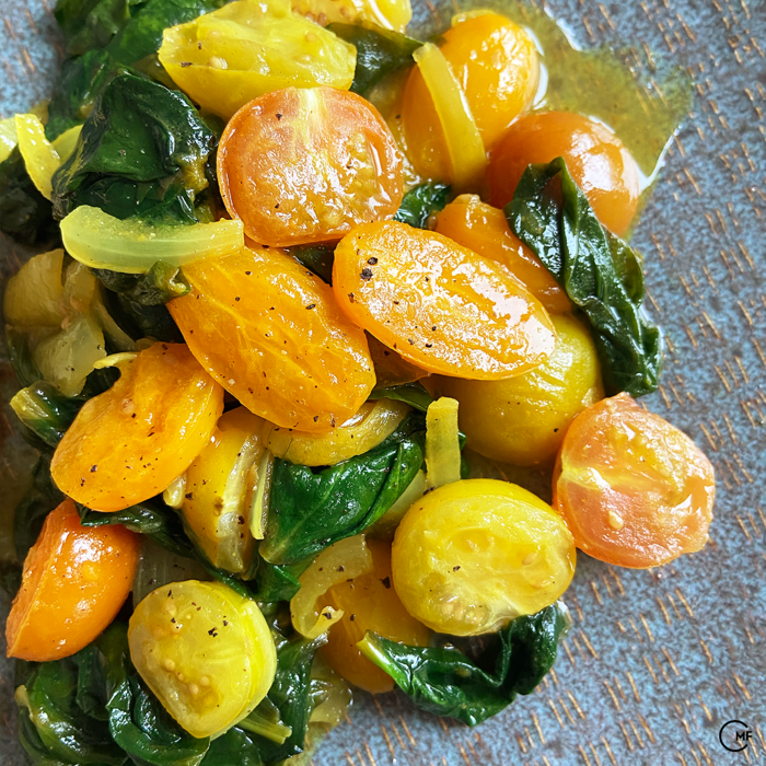 - In a large frying pan cook the onion slices over low to medium heat until they start to soften. Add the cumin and turmeric powder and stir, then add the spinach leaves and let them wilt. Finally, add the tomatoes and three tablespoons of water and let the mix simmer until the cherry tomatoes are soft. Season with salt and pepper to taste.