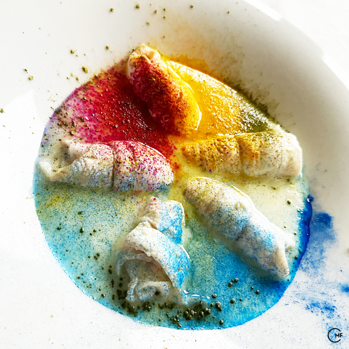 Of course, all the powders I used are natural and eatable. To bring out the vibrance of the colours, I decided to use only white ingredients to have a blanc canvas. I chose white fish filets and for the sauce cauliflower and cheese.