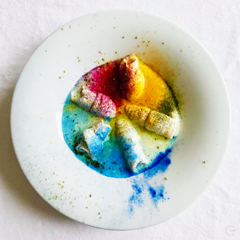 I am sure my Indian friends cook some very delicious regional dishes to celebrate the occasion. My approach to my recipe celebrating Holi is that of a graphic designer. I wanted to use colourful powders like the people in India throw at each other during the celebration.