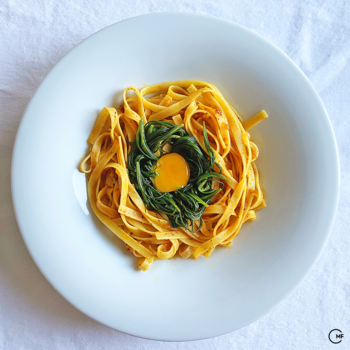 Serving | Spoon the Tagliatelle into deep plates, keeping a dent in the middle. Top with Barba di Frate and finally, place a fresh egg yolk in the centre. Serve immediately.