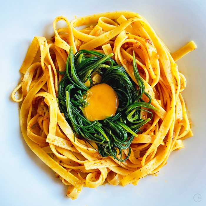 Barba di Frate is the Italian expression for salsola soda, or commonly known in English as opposite-leaved saltwort. It is a succulent shrub that is native to the Mediterranean and typically grows in coastal regions and can be irrigated with saltwater. I love the unique taste of this plant, fresh, green and slightly salty. In combination with pasta, it's an Italian classic – I added an egg yolk to give the dish an extra umami flavour.