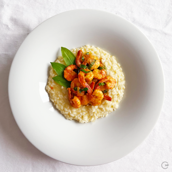 Serving | Ladle the risotto onto the plates and garnish with some wild garlic leaves and spoon the spicey shrimps on top.