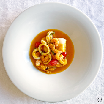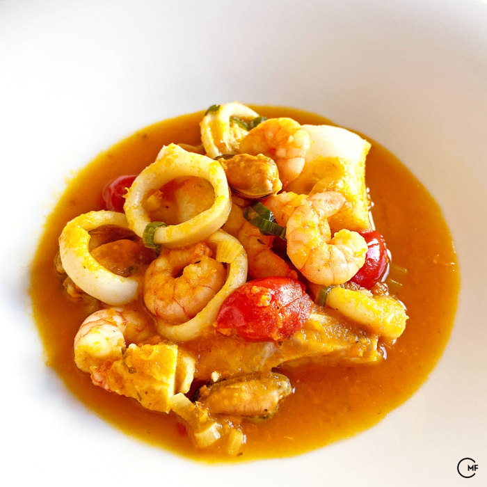 Zarzuela de mariscos is a popular Catalonian and northern Spanish stew of various fish and shellfish. I have eaten it a few times in Spain and always enjoyed it. As a general rule, it is usually served freshly made and accompanied by a sauce called picada consisting of finely ground almonds or walnuts to achieve the right consistency. I didn’t use any nuts in my recipe.